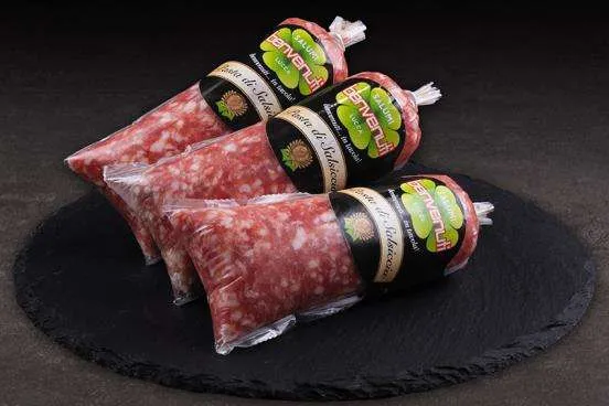 Salsicciafars lavet af udvalgt kød og krydret efter traditionel opskrift. Vakuumpakket for at bevare friskheden. Ideel til pizza, ragù og traditionelle retter.